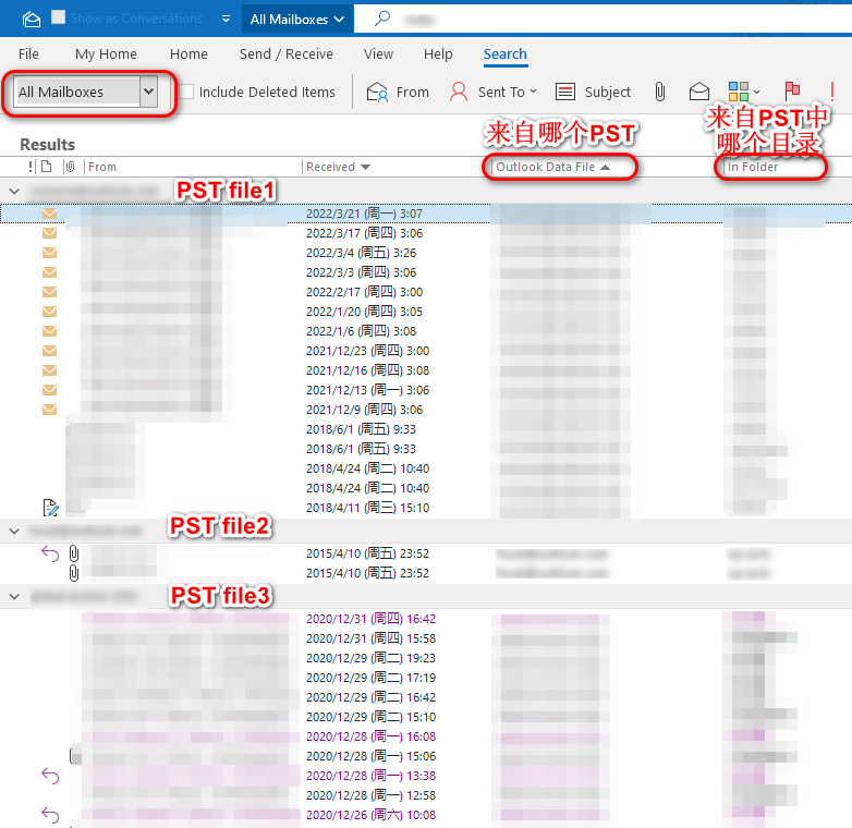 在"Microsoft Outlook" 桌面客户端搜索时选择搜索范围为 “All Mailbox”,这样就可以找到跨PST文件的搜索结果了。