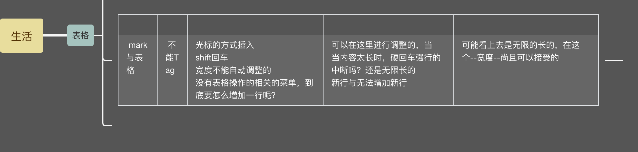 最初,表格与思维导图都是分开的。比如在语雀的表格里分析,分析的差不多,但内容乱七八糟,于是打开Scapple进行组织。于是内容又要搬到scapple里,为了节省这个工作量,开始设想思维导图+表格的集成品。