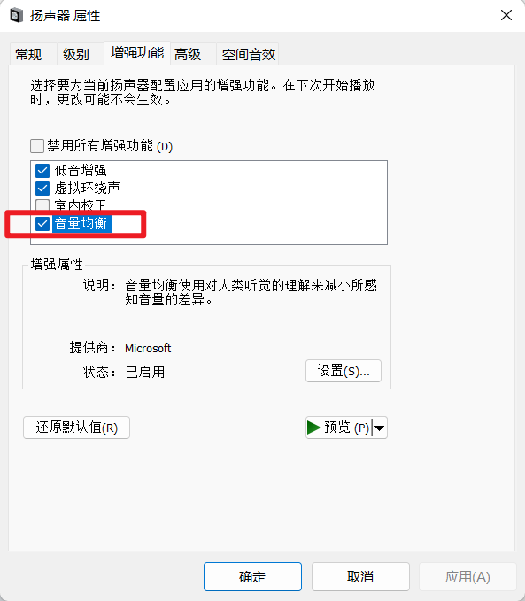 同样的音量,有的视频声音扎耳朵,有的一点也听不见,烦诶!在扬声器属性的增强功能里开启音量均衡会好很多。不过不是所有输出设备都支持这个。