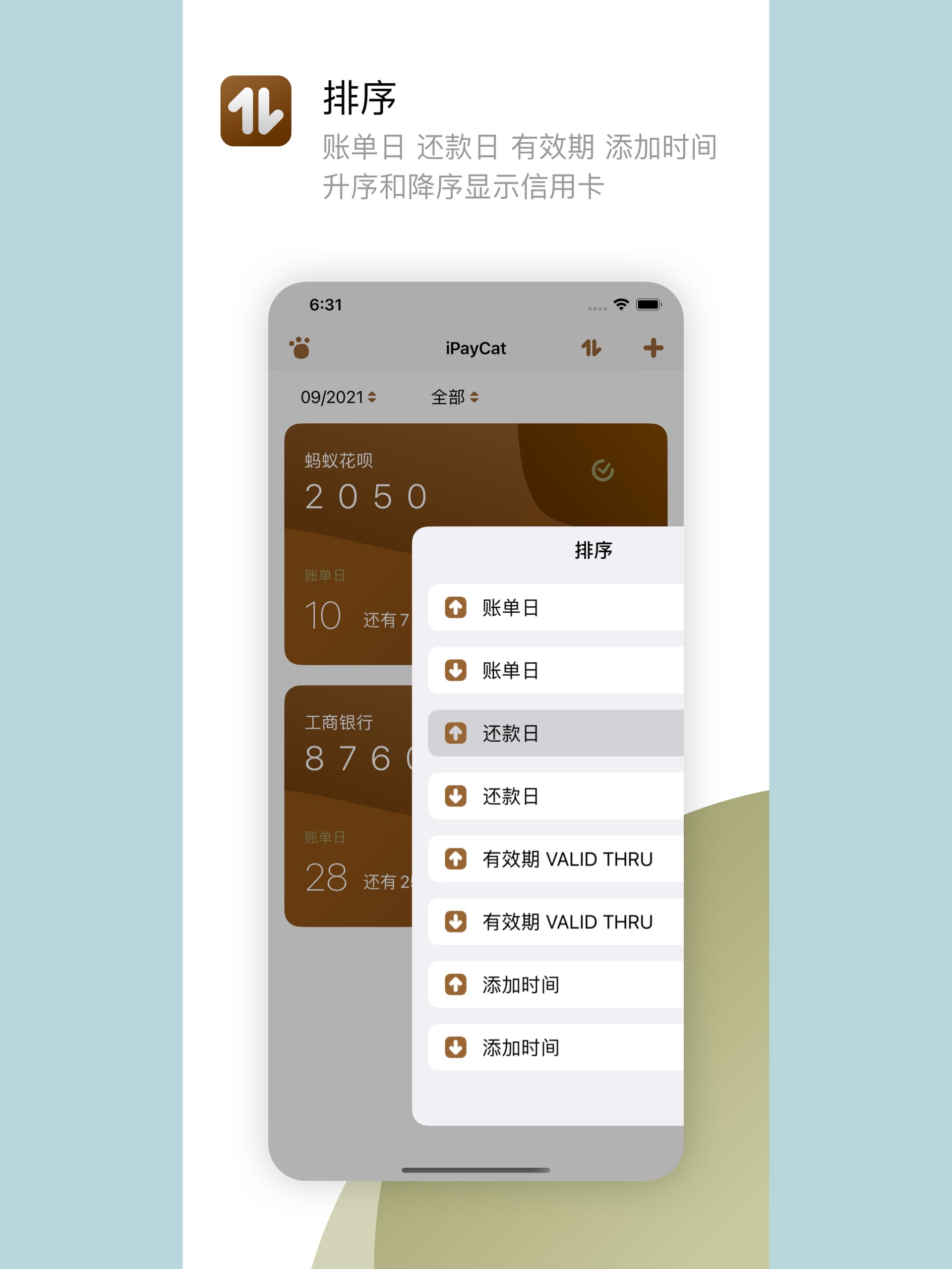 - 排序:升序和降序显示信用卡(按账单日、还款日、有效期和添加时间)。