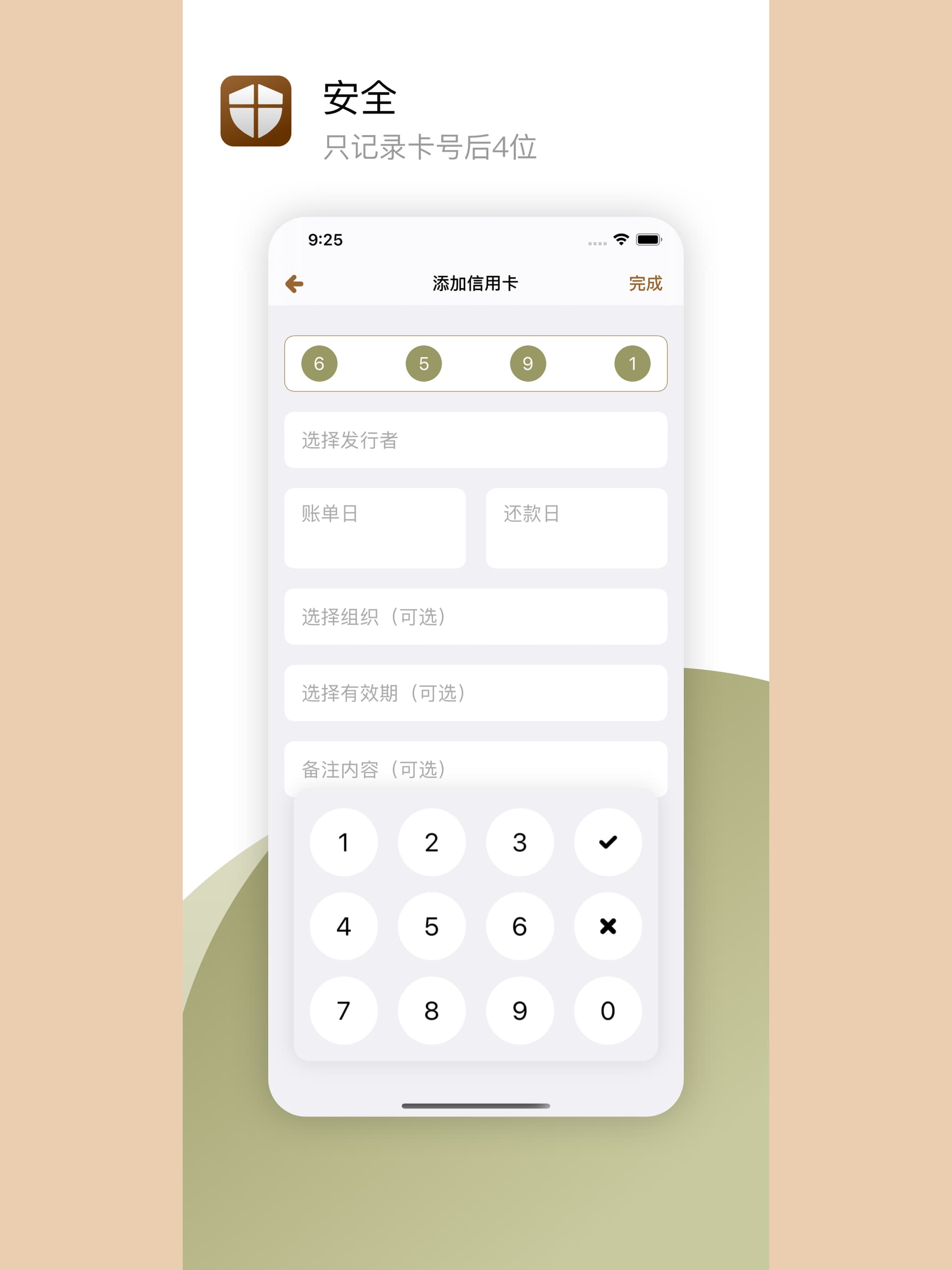 - 安全性:只记录信用卡号的后4位数字即可(或任意4位数字,蚂蚁花呗或京东白条等消费信贷产品,可使用绑定手机号码中的任意4位数字)。