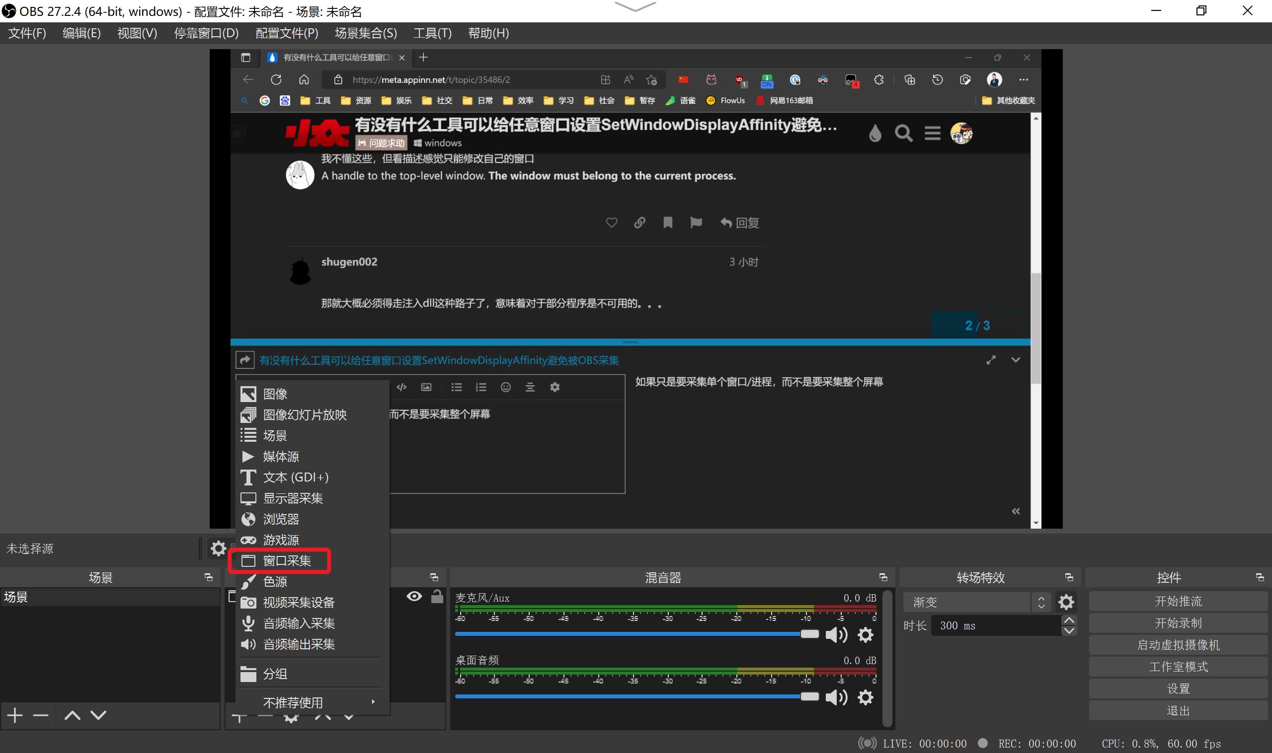 那……只能麻烦一点了,同时采集两个窗口,然后手动到OBS里面调整是否显示了,但显然不大现实。
