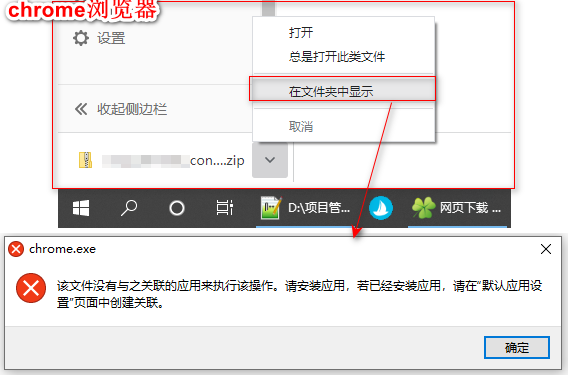 很多应用去打开资源文件夹的时候都会跳出这个 提示:“该文件没有与之关联的应用来执行该操作”,目前比较影响比较大的就是这个 chrome浏览器下载之后没法直接去打开下载文件夹路径;不过我后来发现如果我提前把下载路径文件夹标签打开,再去浏览器下载那点“在文件夹中显示” 能自动激活下载文件夹窗口。