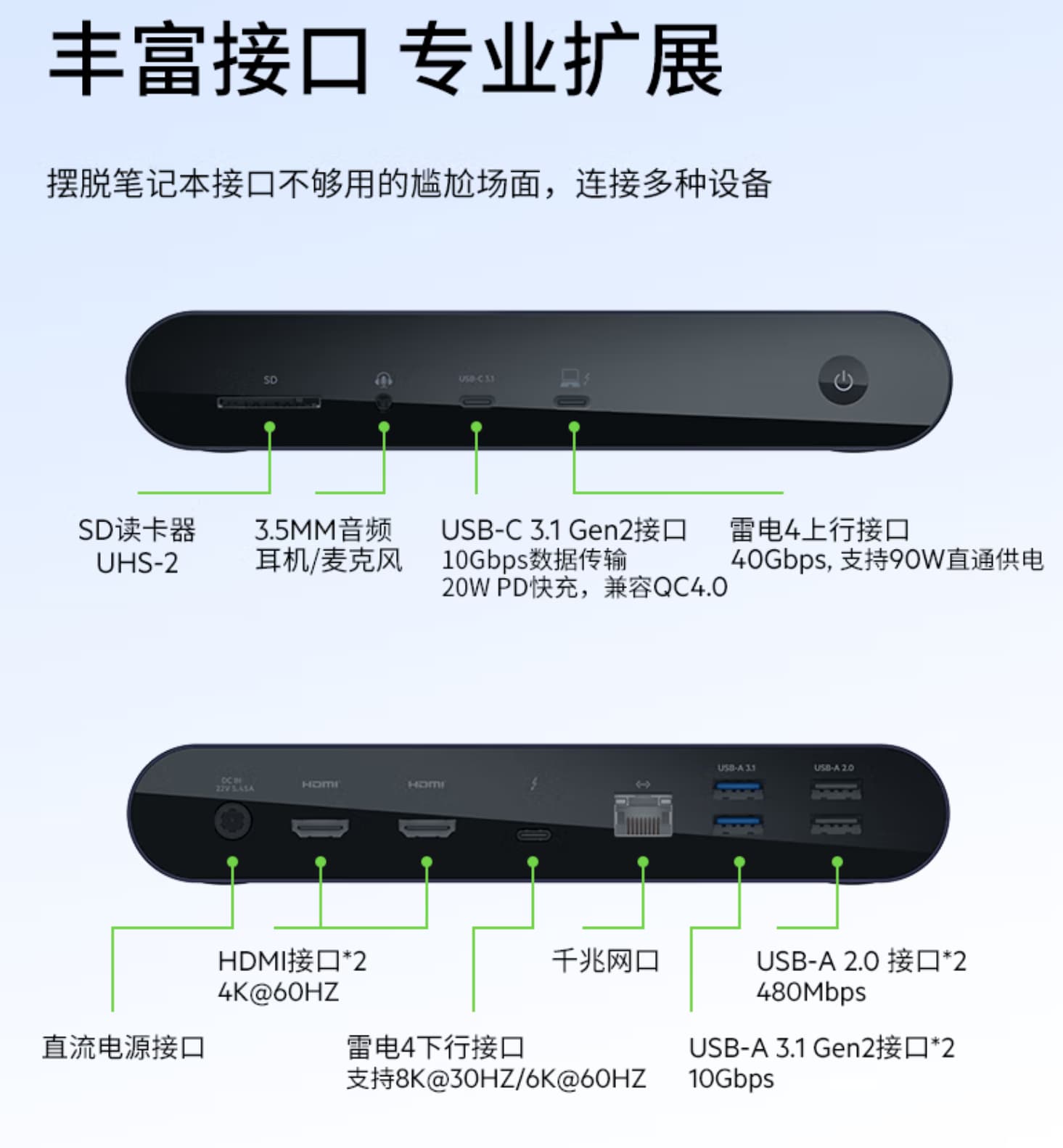 你图上的上行和下行不理解,去搜了发现只有雷电三、四的接口能转出多个type C并供电,而且一搜发现这类设备还不少,只是都需要额外供电,最符合我需要的应该是Anker的一款雷电4 mini dock扩展坞5合1,但是目前这款产品下架了,还是希望USB4设备尽快普及啊