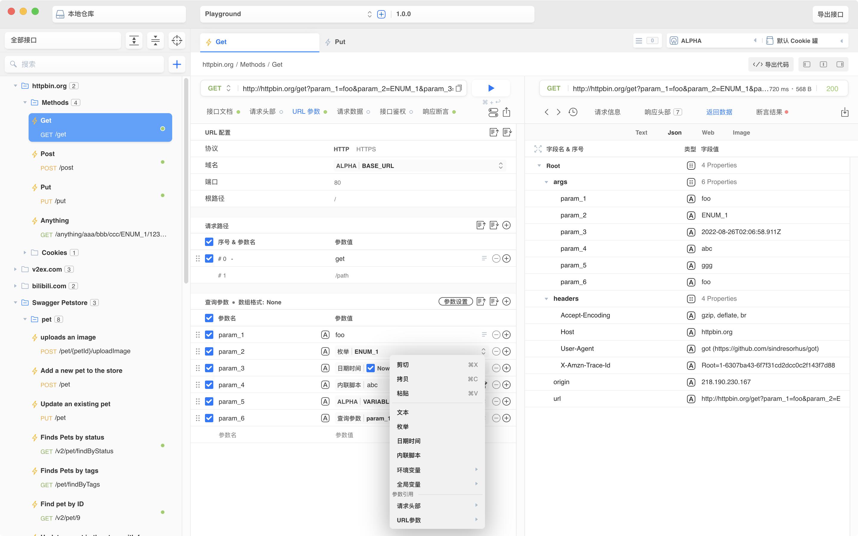 支持引用当前请求的 header/path/query 参数,通过右键菜单直接选取,无需手动输入