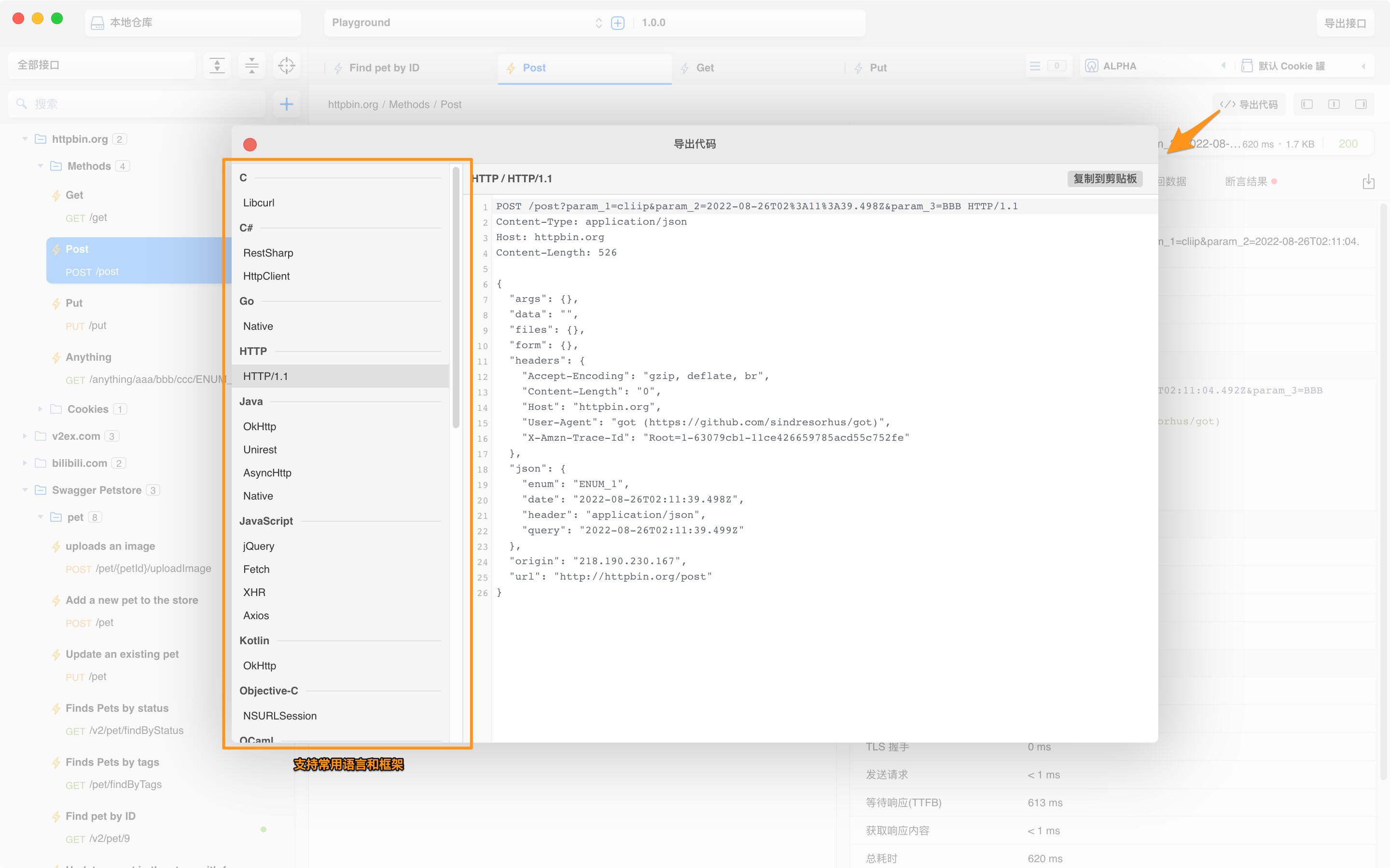 新增了和insomnia同款框架httpsnippet实现的请求代码导出功能,相对于insomnia和postman,在交互流程上做了优化,使用更加方便。
