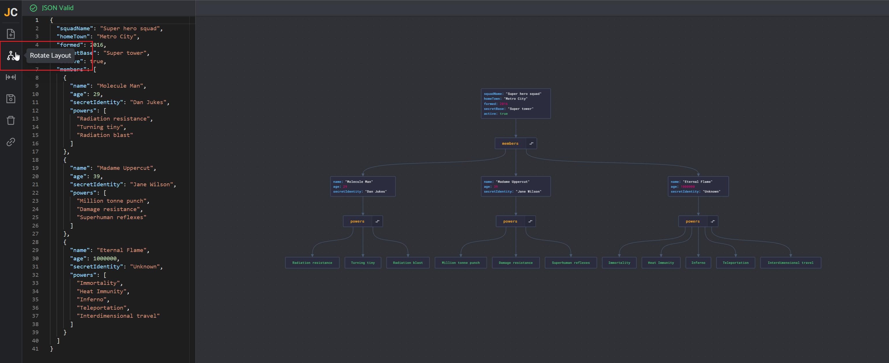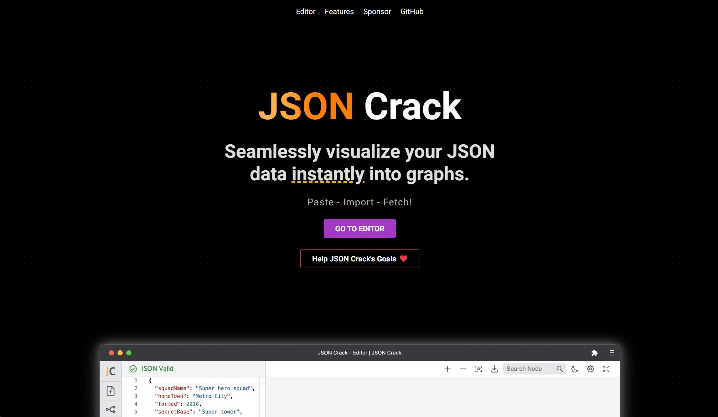JSON Crack是一个开源的JSON数据可视化编辑器,可以导入任意JSON数据,自动转化为树状图表。