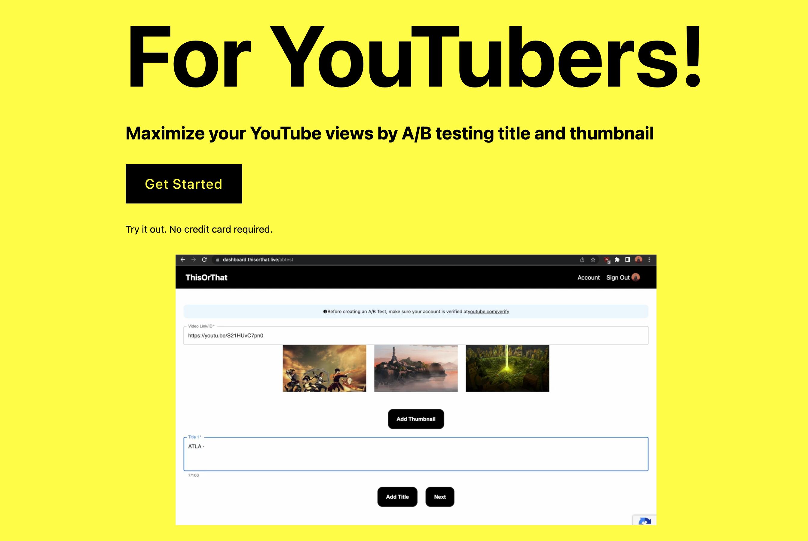 6.ThisOrThat - 这是一个测试 YouTube 封面的工具,不知道具体是怎么实现的功能,就想广告投放一样做A/B测试,看哪个视频的封面的点击率更高。这确实是很不错,Youtuber肯定会有这个需求。