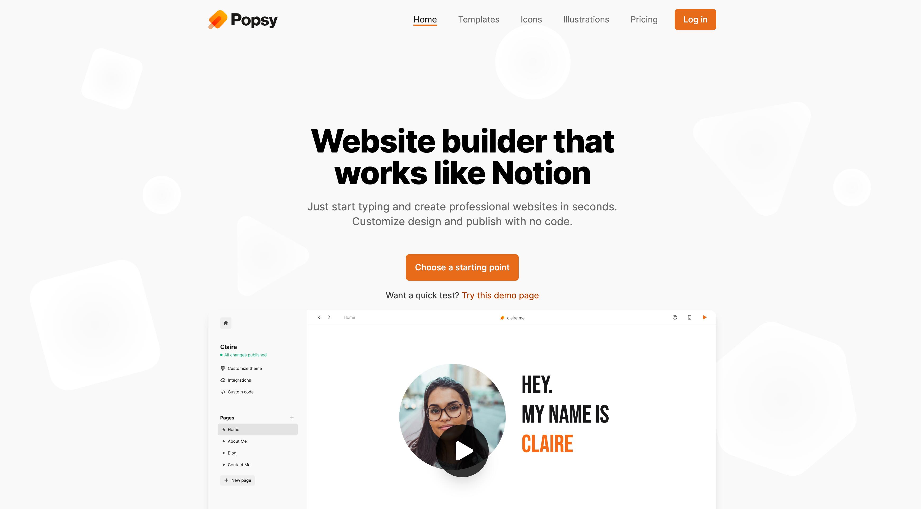 7.Popsy - 这是一个 No-Code 制作网站的产品,可以像 Notion 编辑器一样制作网站,非常简单好用。官网有很多模板可以参考,关注这个产品也很久了,上周在 ProductHunt 上线了,反响很不错,