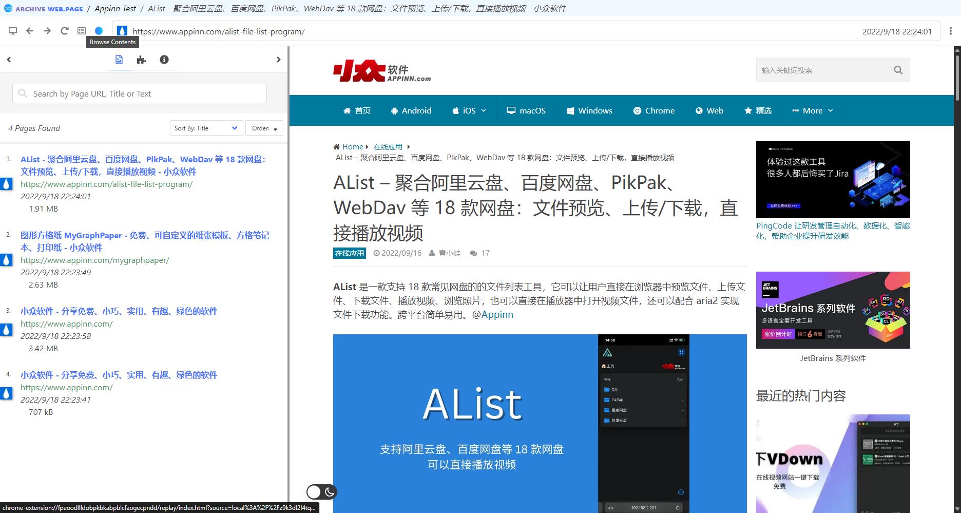 实现上,这一插件使用了 Chrome 系浏览器的调试机制来获取外链资源,所以 Chrome 系列的浏览器应该都能使用。存储下来的网页不仅可以用插件在进行录制的浏览器中访问,更可以导出成通用的 WACZ (Web Archive Collection Zip) 或 WARC (Web ARChive) 文件,在其他工具中使用/回放(如 ReplayWeb.page)。