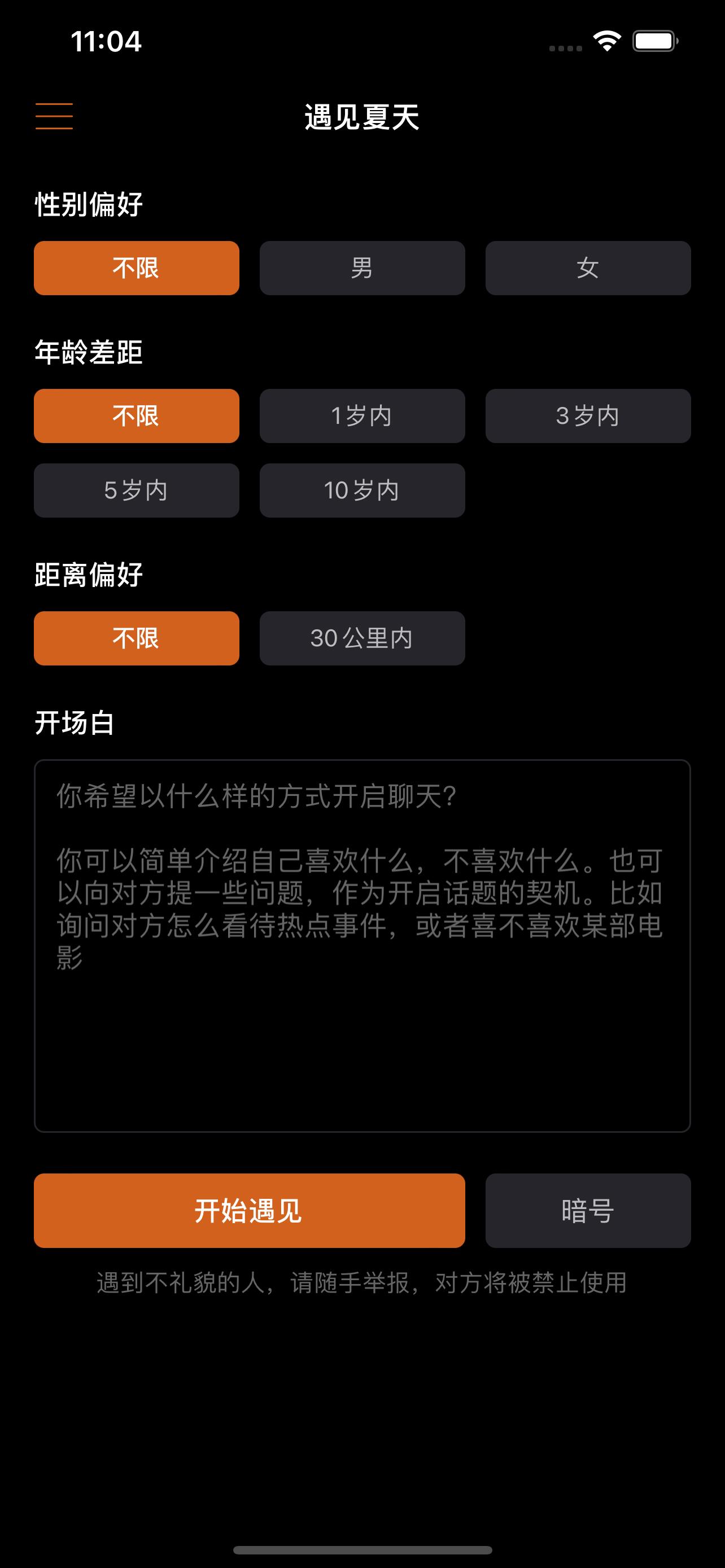 遇见夏天是一个匿名匹配的聊天 App。希望通过举报机制营造健康的环境,帮助你找到合拍的人