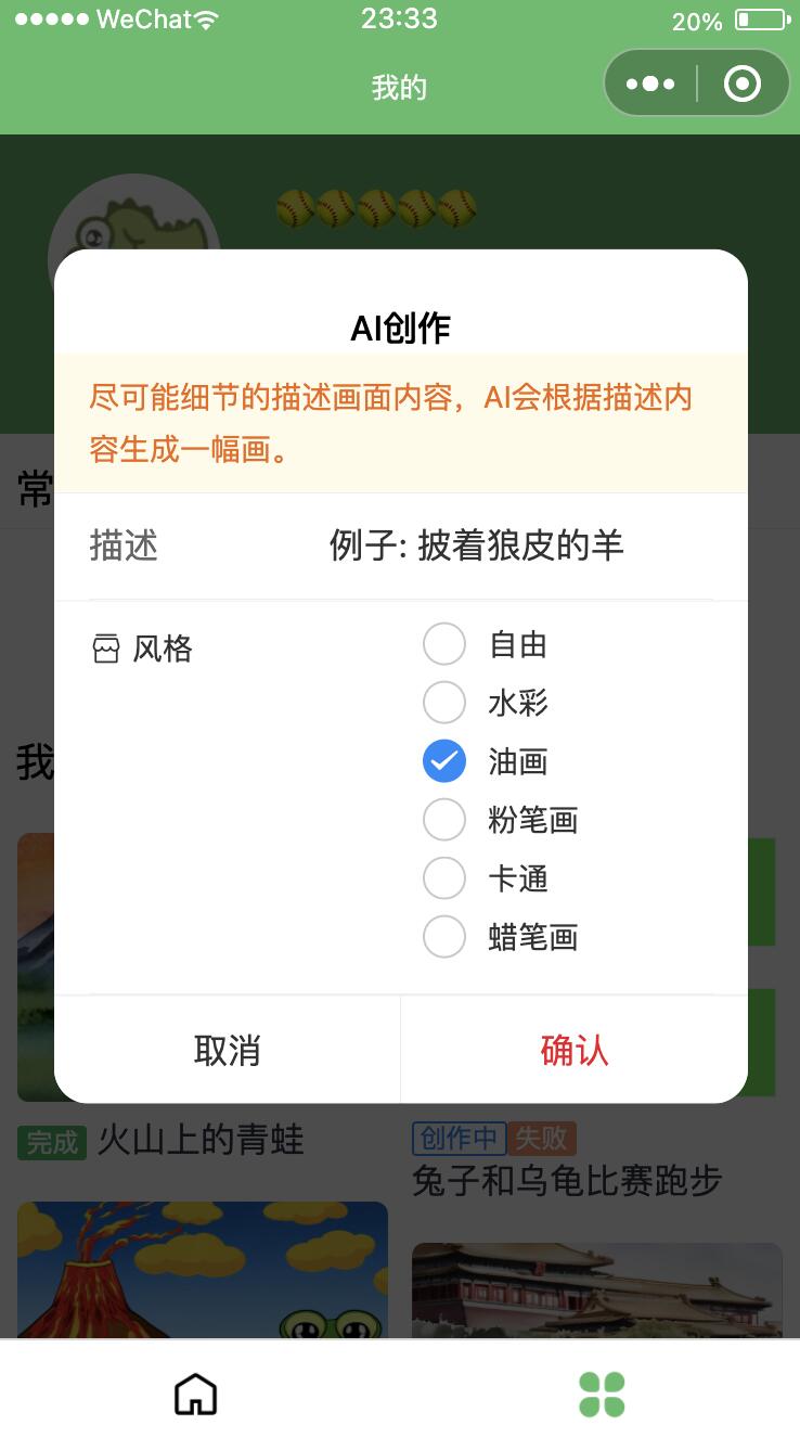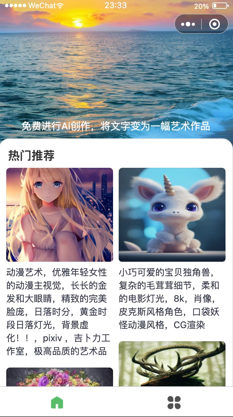 《画几个画》是一个免费的微信小程序,只需要输入文字描述 ,在30秒内就能根据文字生成一幅艺术作品。小程序界面也是清爽无广告,