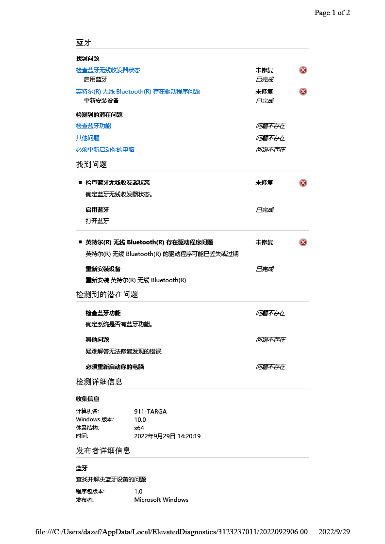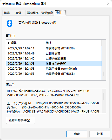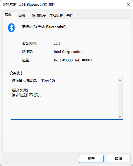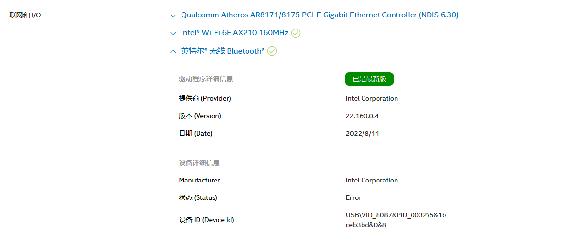 - 最担心的就是主板上跟蓝牙关联的线路烧坏了(我也不是很懂), 但是"设备管理器”里面能看到 Intel Wareless Bluetooth, 在Intel驱动程序网站里自动检测的时候, 也能检查到这个蓝牙模组, 虽然使用状态是error. 能检测到就应该是多半是软件类驱动类问题吧?