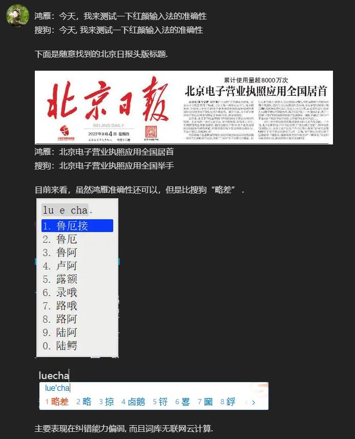 鸿雁输入法并未采用中文语法算法引擎,仅仅依靠统计学的数据做成的候选词排名