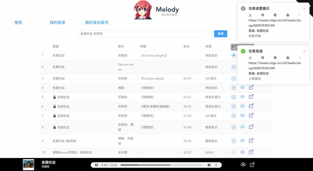 用户检索指令 > Melody > 从各大平台获取 > 本地临时文件 > 上传云盘 > 批量下载
