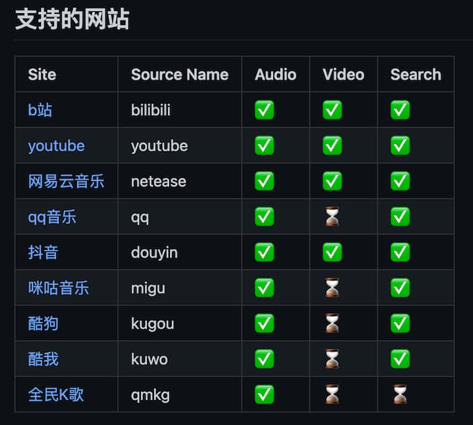- 支持在各大音乐和视频网站检索歌曲。目前支持 咪咕、网易云、QQ 音乐、酷狗、bilibili、抖音等站点。详情可以在我的 media-get 项目中查看