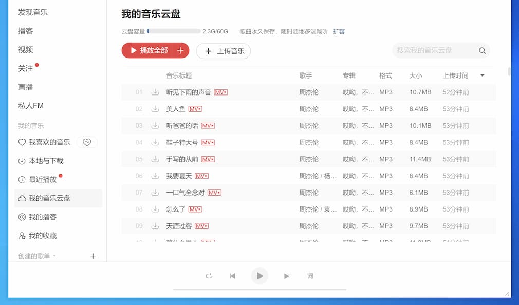 - 关键词搜索歌曲:如果试听后是你想要的,点击上传按钮会将该歌曲上传到你的网易云音乐云盘