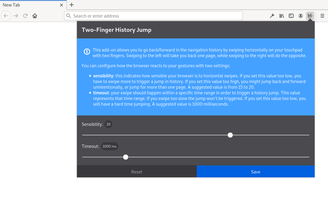 在Chrome类浏览器上,都可以在触控板上进行双指右化/左划,来实现网页后退/前进的操作。不知道是否可以在Waterfox/Firefox上相同的功能?