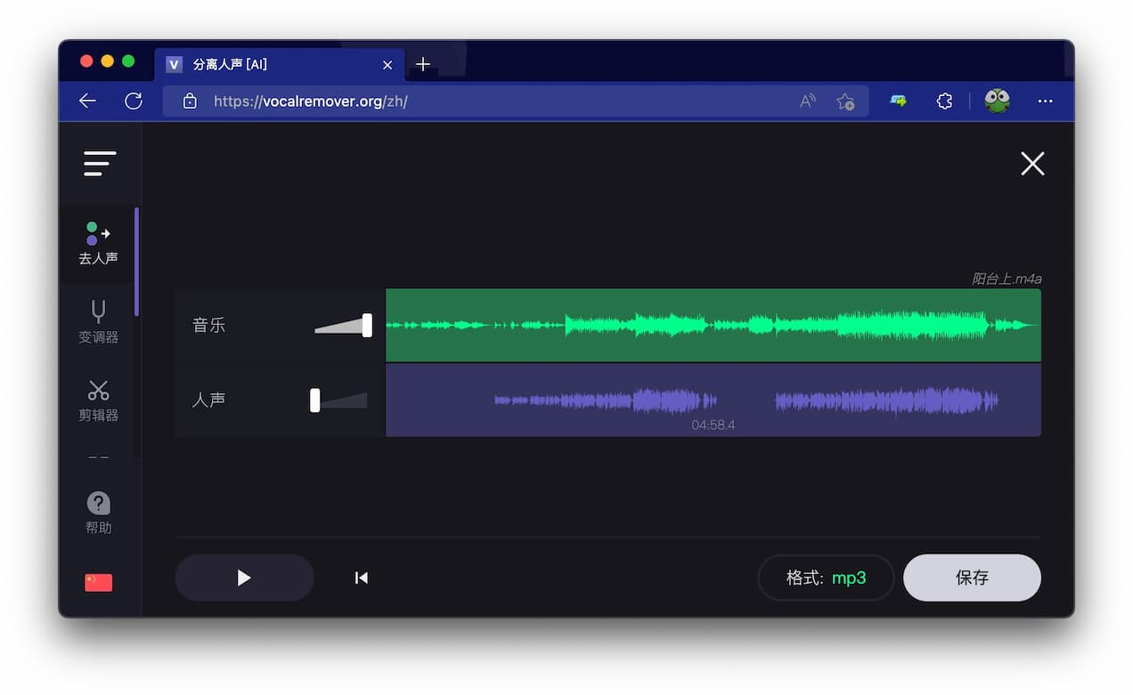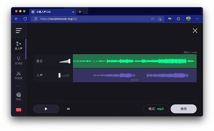 原始链接在: VocalRemover - 强大的在线音频处理工具:人声分离、变调、剪辑、合并、录音、卡拉OK - 小众软件