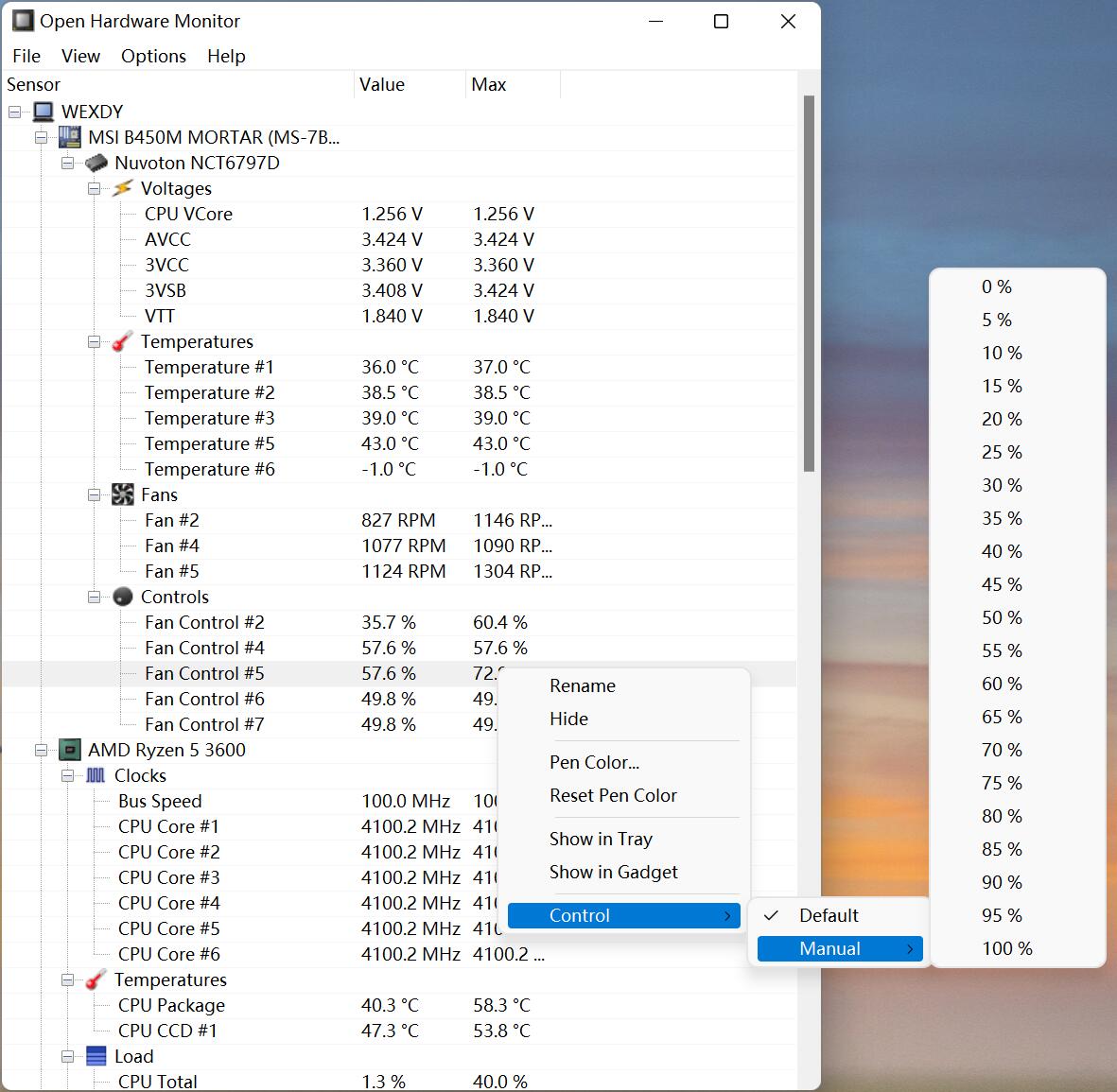 既然发现了问题,咱就要解决问题。首先咱就想到了风扇吵是因为功率高,或者说转速快。那既然转速过快,那限制一下转速是不是就可以了呢?说干就干。先找找现成的工具吧。开了OpenHardwareMonitor,里面可以手动控制风扇转速。调了一下,发现啊。成!只要把噪音最大的那个风扇控制到80%以下,噪音基本就能接受了。