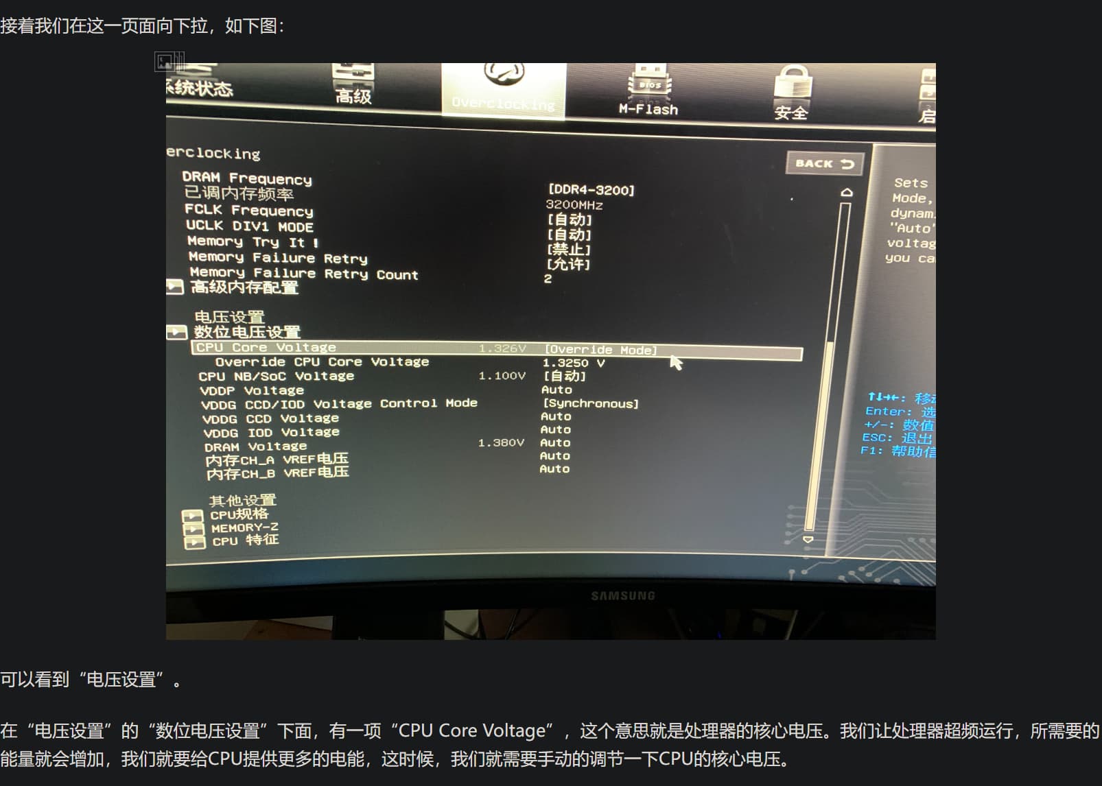 就在时不时手贱去看温度的时候,咱忽然又想到了,CPU温度高说明什么?说明CPU的功耗高啊,CPU功耗为什么会高呢,肯定是咱超频给的电压太高了。再来看看怎么给CPU限电压。知乎网友指出,可以用定压睿频来压温度。那咱就来试试。先是Ryzen Master搞了搞,发现限不住电压。切换配置文件重启了几次都没用。看来不能优雅了,只能进BIOS。一进才发现,原来风扇一直满载运行是因为BIOS里的风扇控制被关掉了。不过没关系,咱有更好的了。转去调节电压就行了。电压随便给个1.25,频率不管。开机看看。电压确实是限住了。但是温度还是没见低啊。看来已经没法子了。