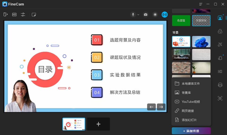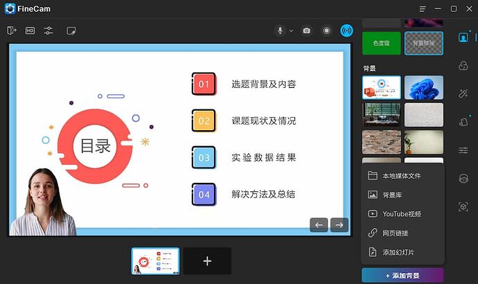 想实现人物抠图换背景?无需借助第三方工具,FineCam 自带背景移除、模糊等效果,可添加本地文件、图片、幻灯片、网页等作为背景。