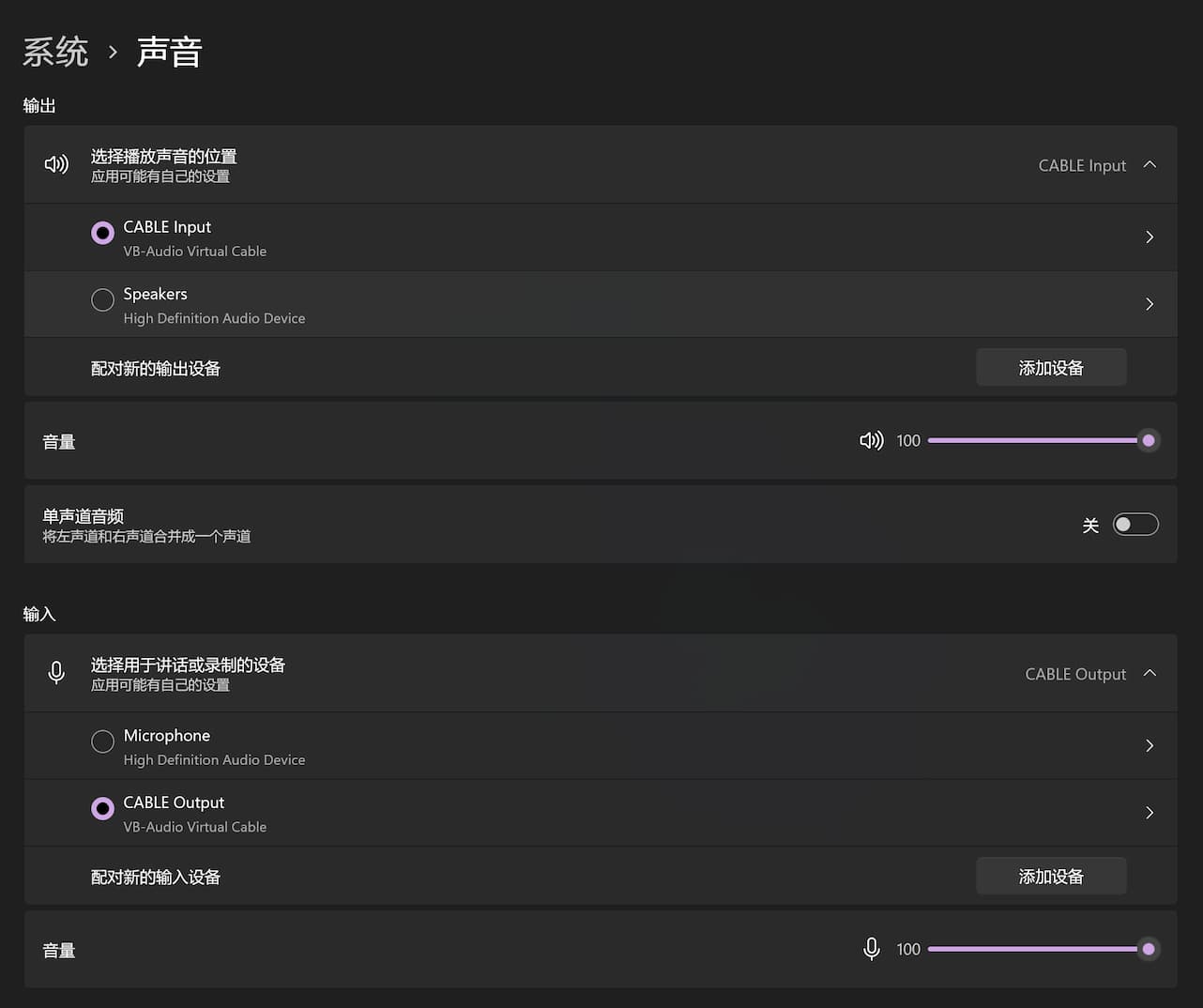 在使用管理员权限安装 VB-CABLE 之后,进入系统声音设置,将输出输入设备都选择为 CABLE 即可: