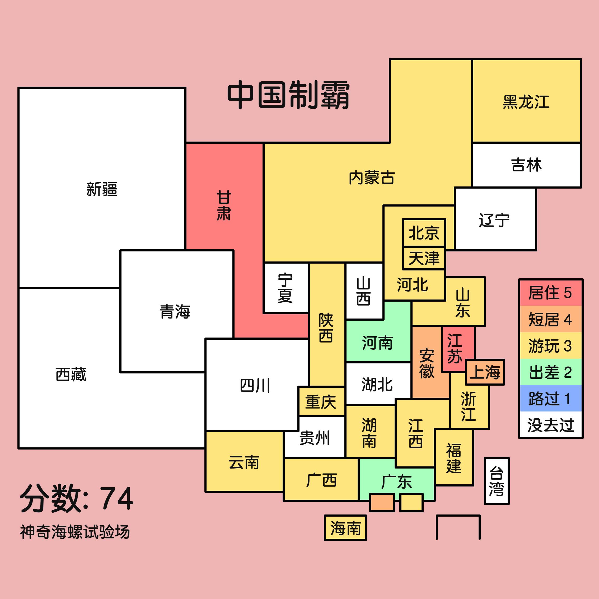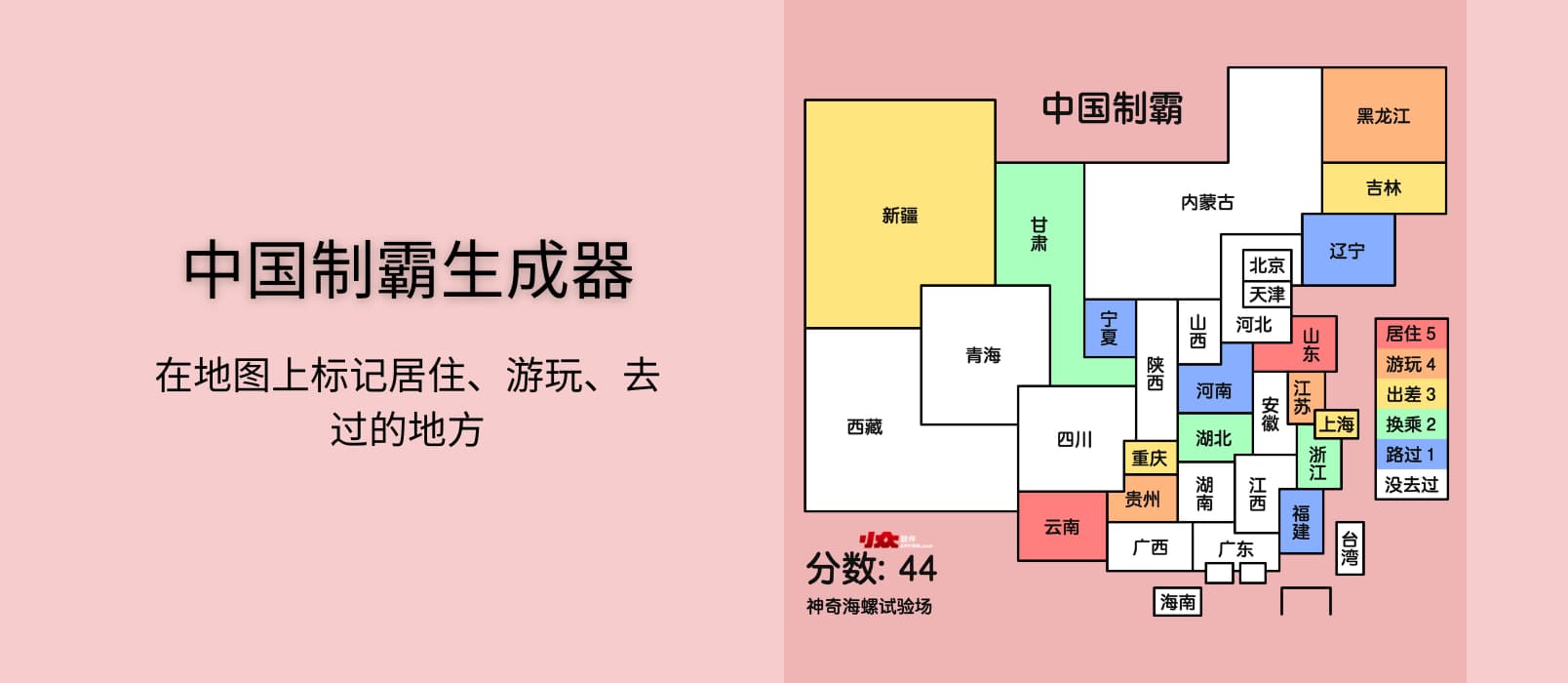中国制霸生成器 是一个开源的在线小游戏,你可以在简化的中国地图上用不同颜色标记居住、游玩、去过的地方,然后生成一张图片。@Appinn