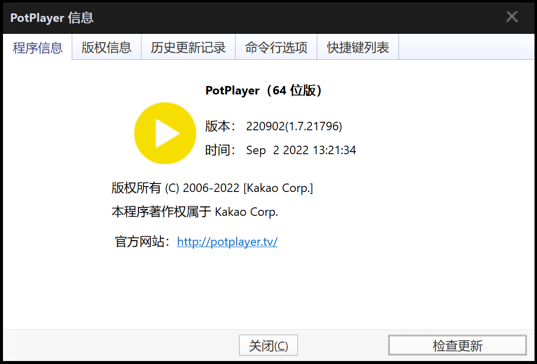 不过,在PotPlayer的关于界面中,我们可以看到它的官网。