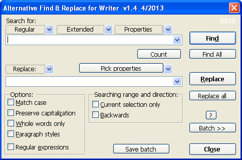 AltSearch 是为 LibreOffice Writer 开发的扩展程序,可以输入正则表达式进行查找和替换。