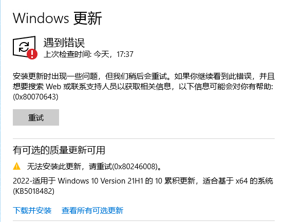 起先发现通知区域Windows安全中心的图标不见了,而后打开安全中心设置,提示定义已过期,手动更新失败。再打开Windows更新显示: