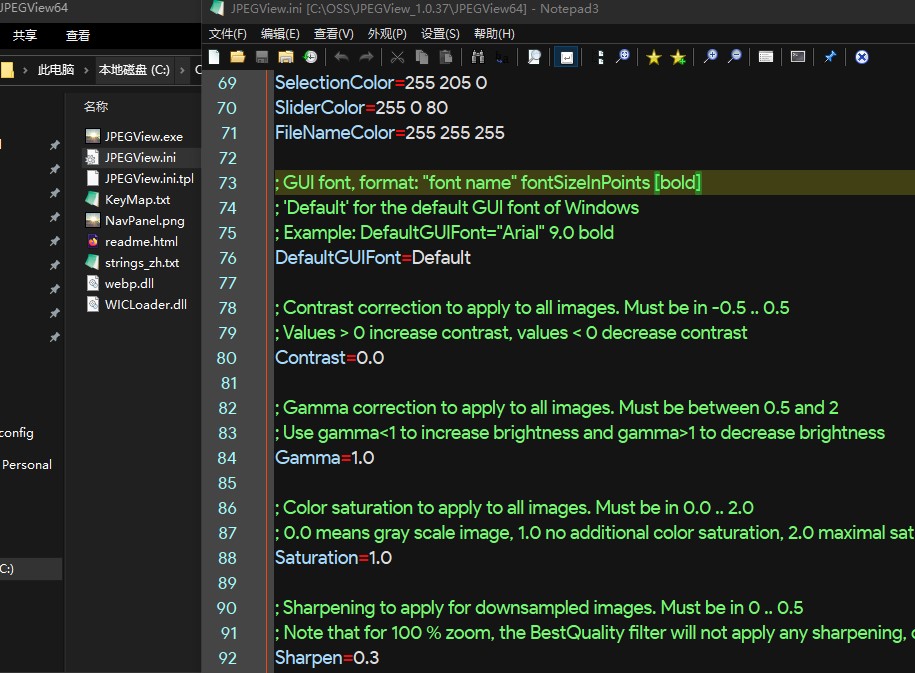 另一个绿色软件jpegview的例子,主程序exe同文件夹内就有.ini设置文件,啥文档readme都不看点进去也知道可以改一些东西。而mpv的几个path都是一片空白,新手连设置文件的存在都不知道。