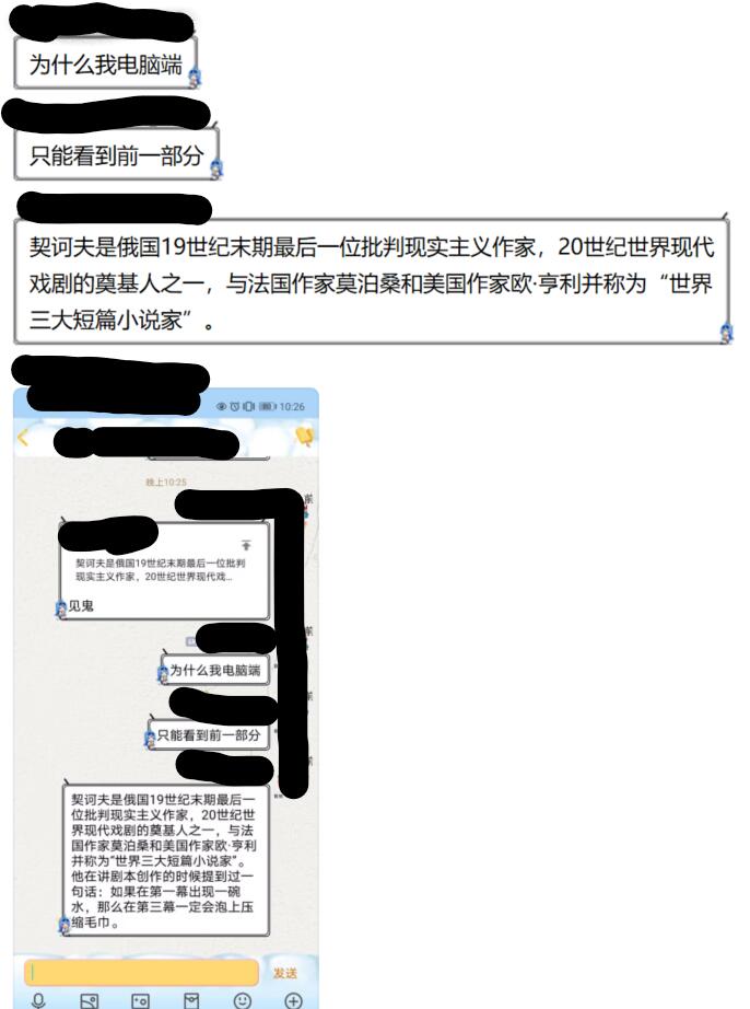 个人这边设备也是如此,而且用手机全文复制发送到微信PC端也会有后半部分内容未能显示的情况。用电报telegram就能正常显示。使用脚本之家的unicode中文转换工具之后发现有个'%00'导致后面的内容被截断了,我想知道为什么这会影响到PC端而不会影响移动端?是传递方式不一样?