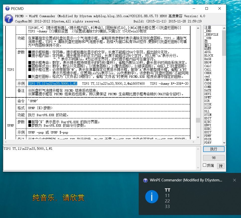 我以前也有过这样的需求(通过命令行操作在任务栏显示气泡通知),当时是用PECMD实现的(一个500k的全能工具,我是在使用PE维护系统时候发现的),但是杀毒软件会一律给pecmd报毒,后来就没怎么用了。如图,在Win10 21H2测试时是能弹出气泡的,但是过一秒就会消失。这一点可以通过写脚本文件来实现,如有问题可以再问我。