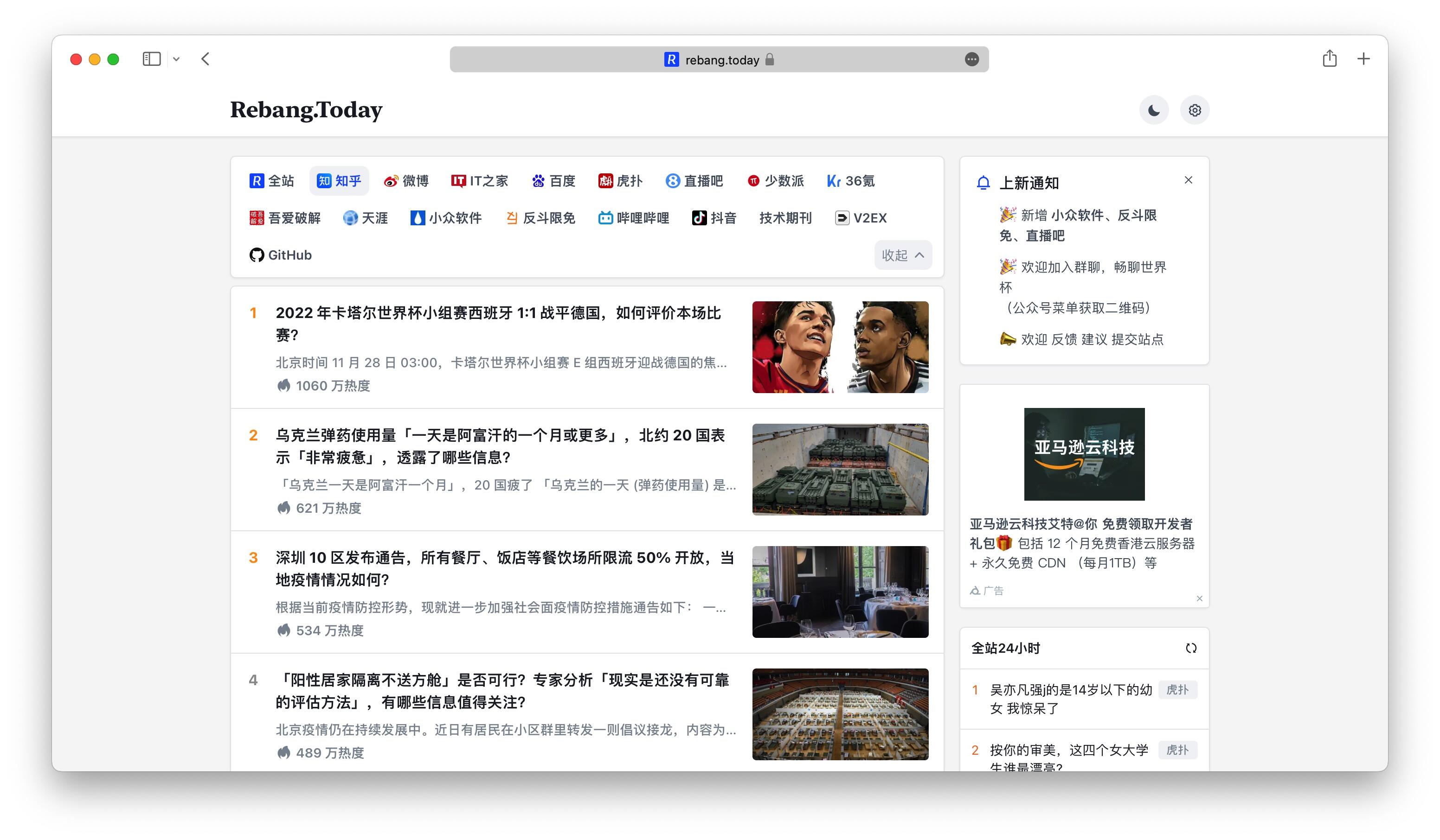 这是一个简洁干净的热榜网站,这里汇聚了全网热搜:小众软件、知乎热榜、微博热搜、百度热搜、IT之家、36氪、少数派、虎扑、天涯、bilibili、抖音、吾爱破解、GitHub、技术期刊、直播8、反斗限免