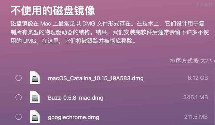 系统使用一段时间之后,Mac 中都都会遗留下不少 .dmg 文件,很多软件安装包就以 .dmg 文件存在,甚至 macOS 的系统安装包也是,这些文件随便删,大不了重新下载就是。
