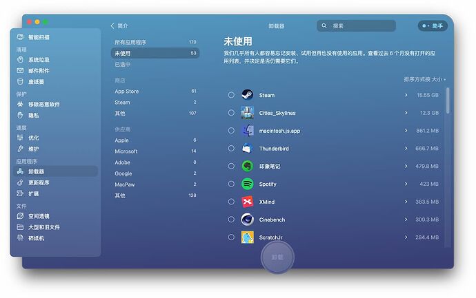 CleanMyMac X 的卸载未使用的软件功能可以帮助用户找到那些从来不用的软件,删掉它。至于未来需要,再次安装就好了嘛。