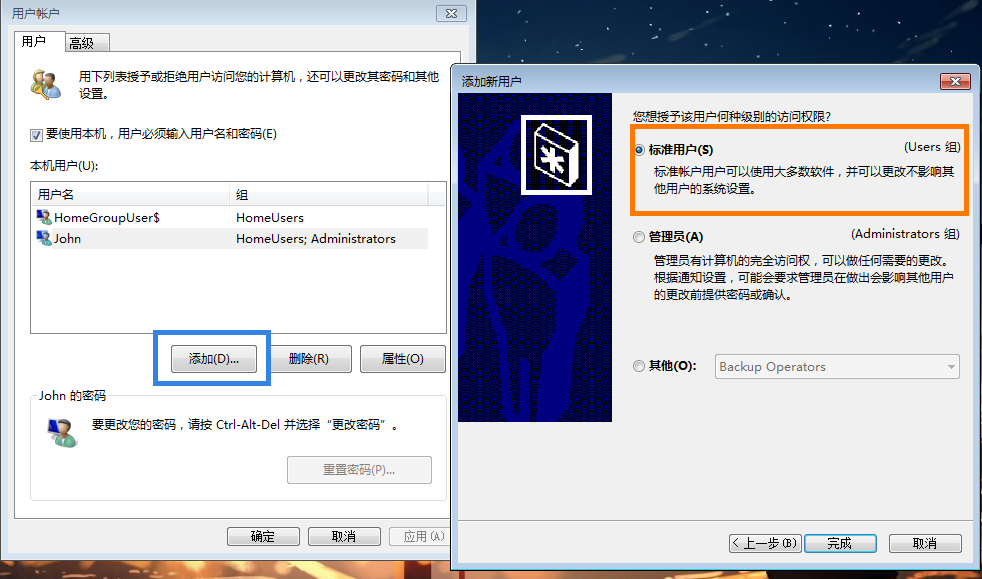 3 【为上网课的孩子配置权限受限的账户】点击 “添加” 按钮,为孩子新建一个账户,可以不设密码,注意用户类型要设置为标准用户。