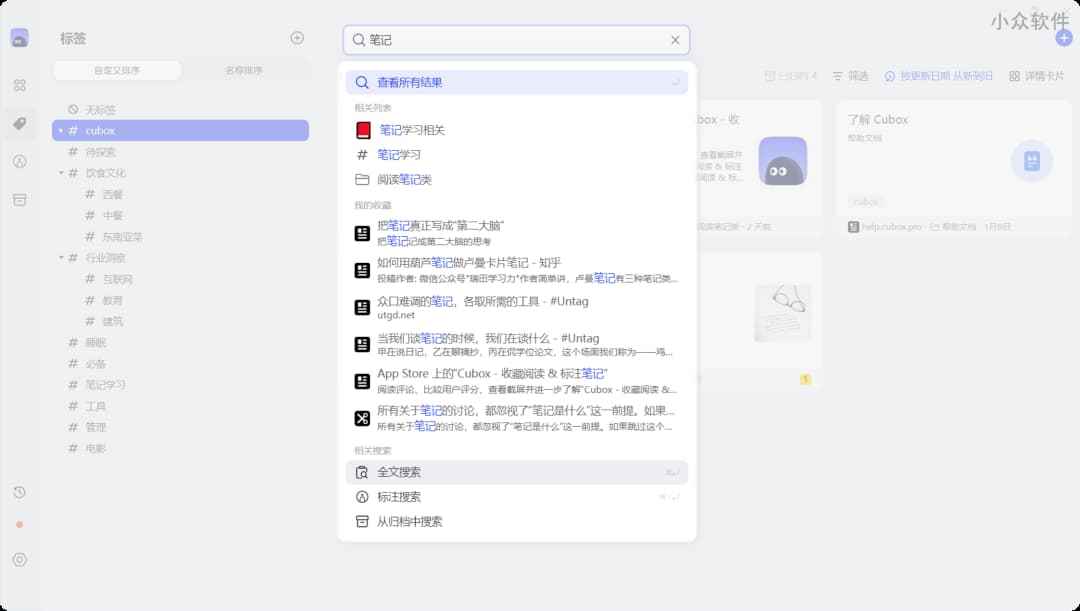 在 Cubox,既可以对收藏的网页内容进行地毯式的搜索,也可以对标注进行单独搜索,即使是归档的文章也能搜到。