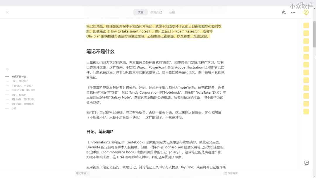 文章收藏后当然要进一步阅读,Cubox 的阅读器能自动解析正文,生成干净清爽的阅读界面,侧边栏还有大纲助你迅速掌握文章结构。