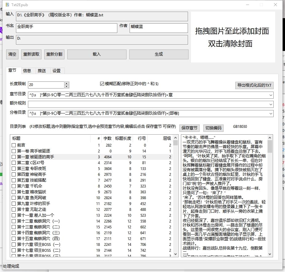 比如,下面这一句命令行,可以转换 小说.txt 文件,并且设置作者 小众软件,封面 appinn.png,匹配章节 第x节。