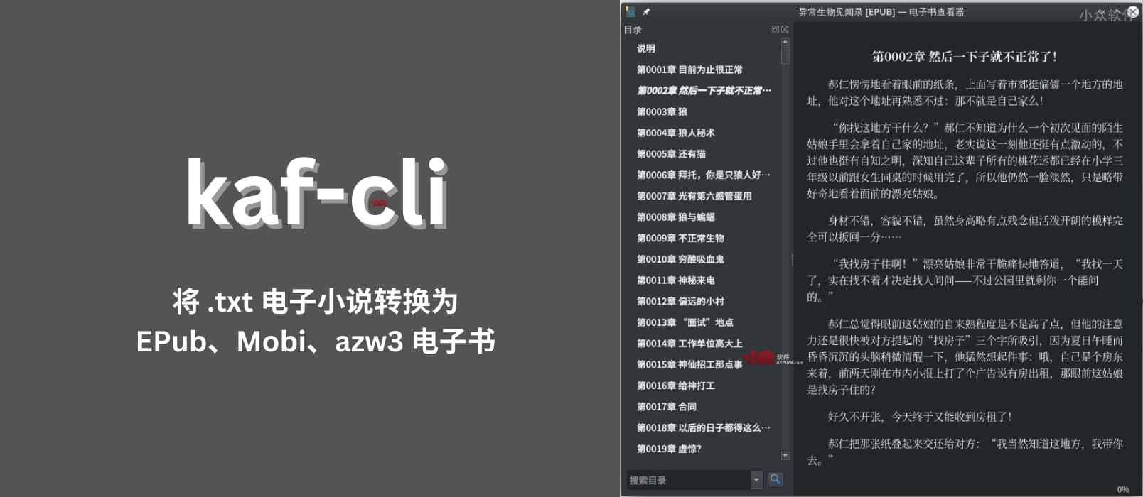 原始链接在: kaf-cli - 将 txt 小说转换为电子书(EPub、Mobi、azw3),带封面、目录[Win/macOS/Linux/Android] - 小众软件