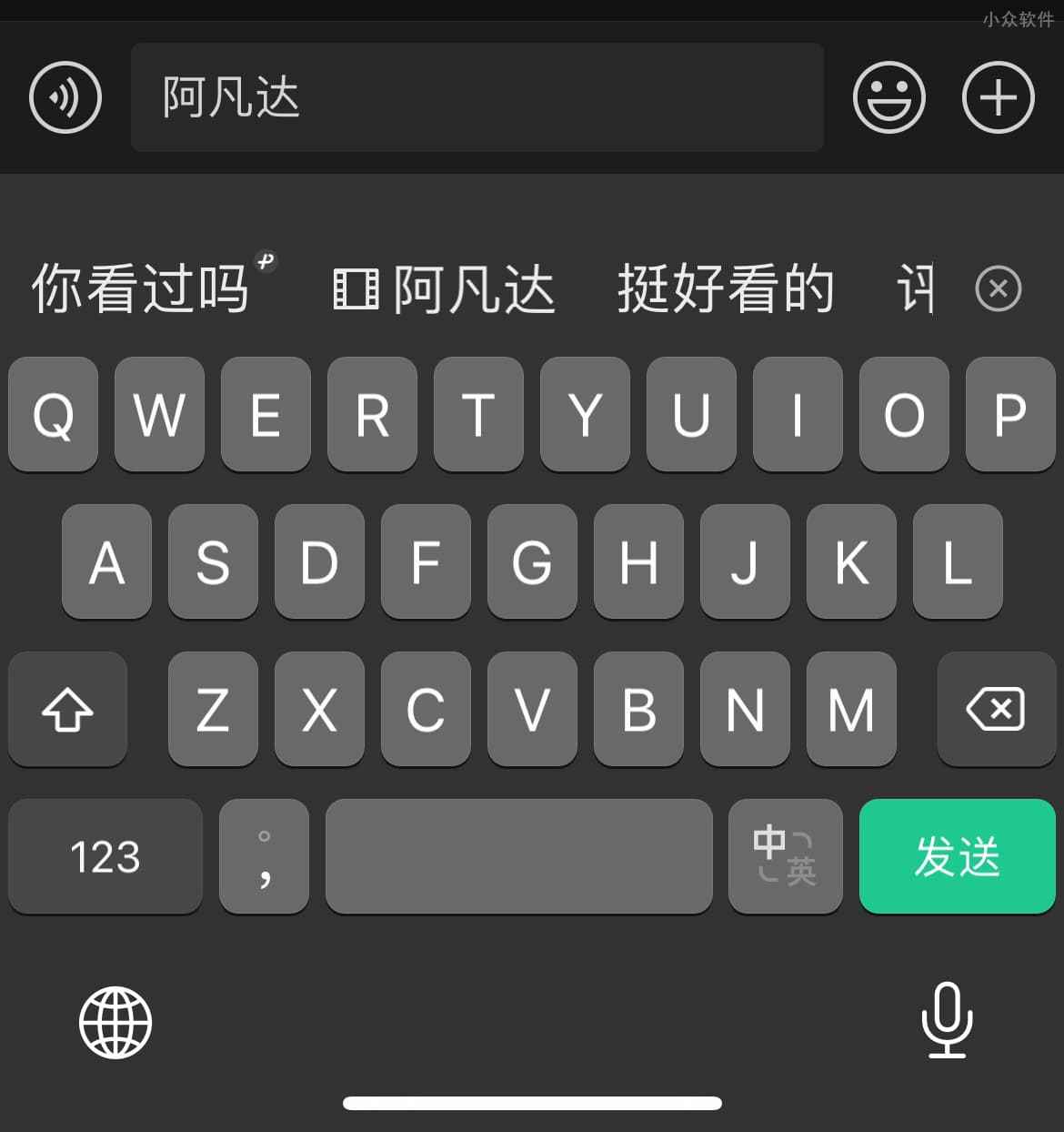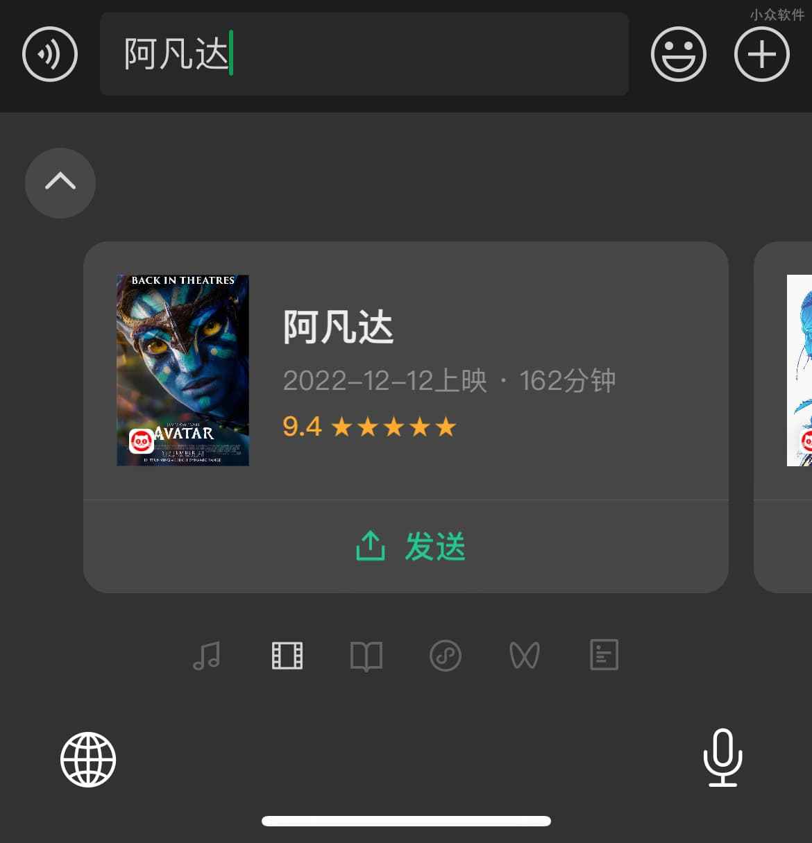 至于打字体验,青小蛙觉得还是非常流畅的,在微信中输入的时候,还可以自动识别音乐、书籍、电影等内容,比如下方搜索阿凡达,点击🎬图标后,可以发送猫眼内容。
