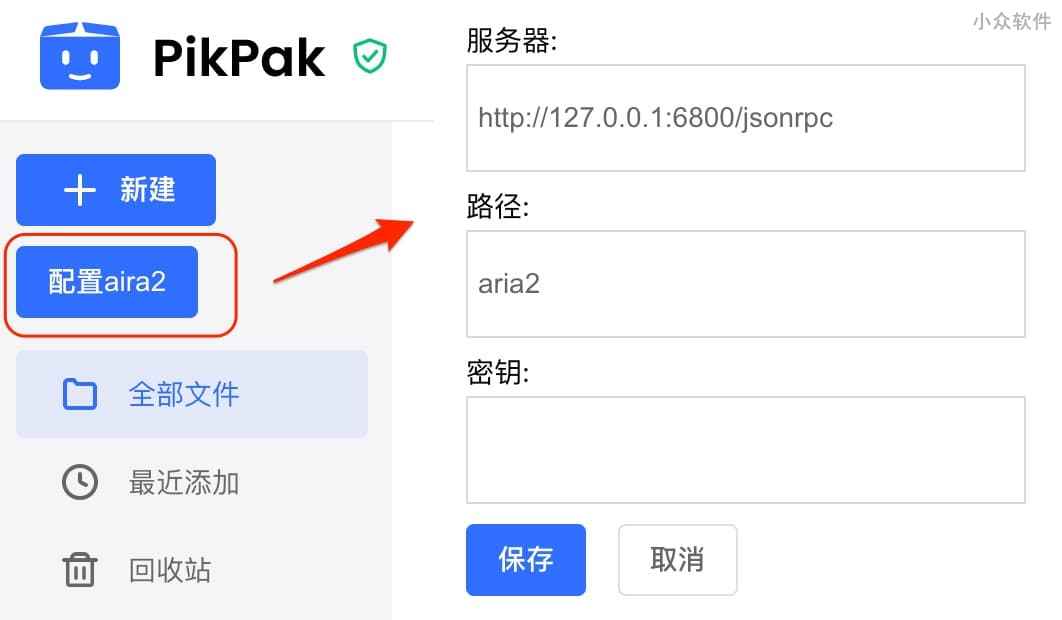 然后,在打开 PikPak 网页版(注册邀请码 445445,邀请链接)之后,就能看到在左侧新建按钮下方的配置aria2 按钮了,然后根据情况输入你的 aria2 地址即可(路径可以留空):