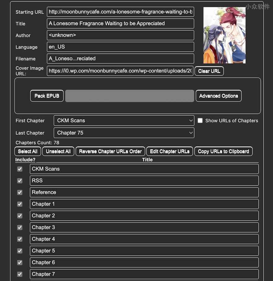 然后只需要挑选 First Chapter 第一章 和 Last Chapter 最后一张,点击 Pack EPUB 就能保存为 Epub 格式了。