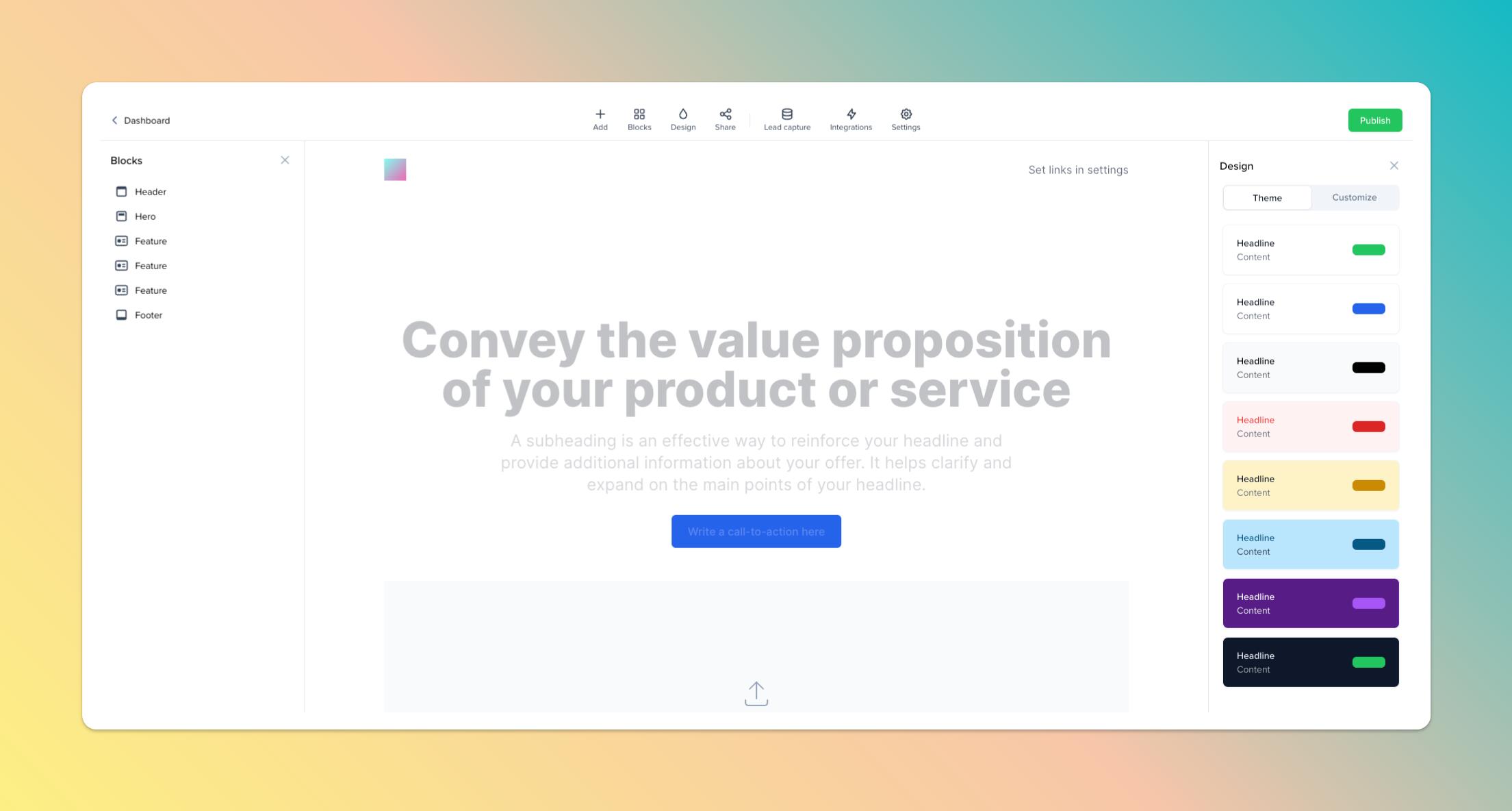 10分钟,即可轻松构建落地页,将你的想法与创意展现出来,EarlyBird为你提供一个与潜在客户对话的通道。