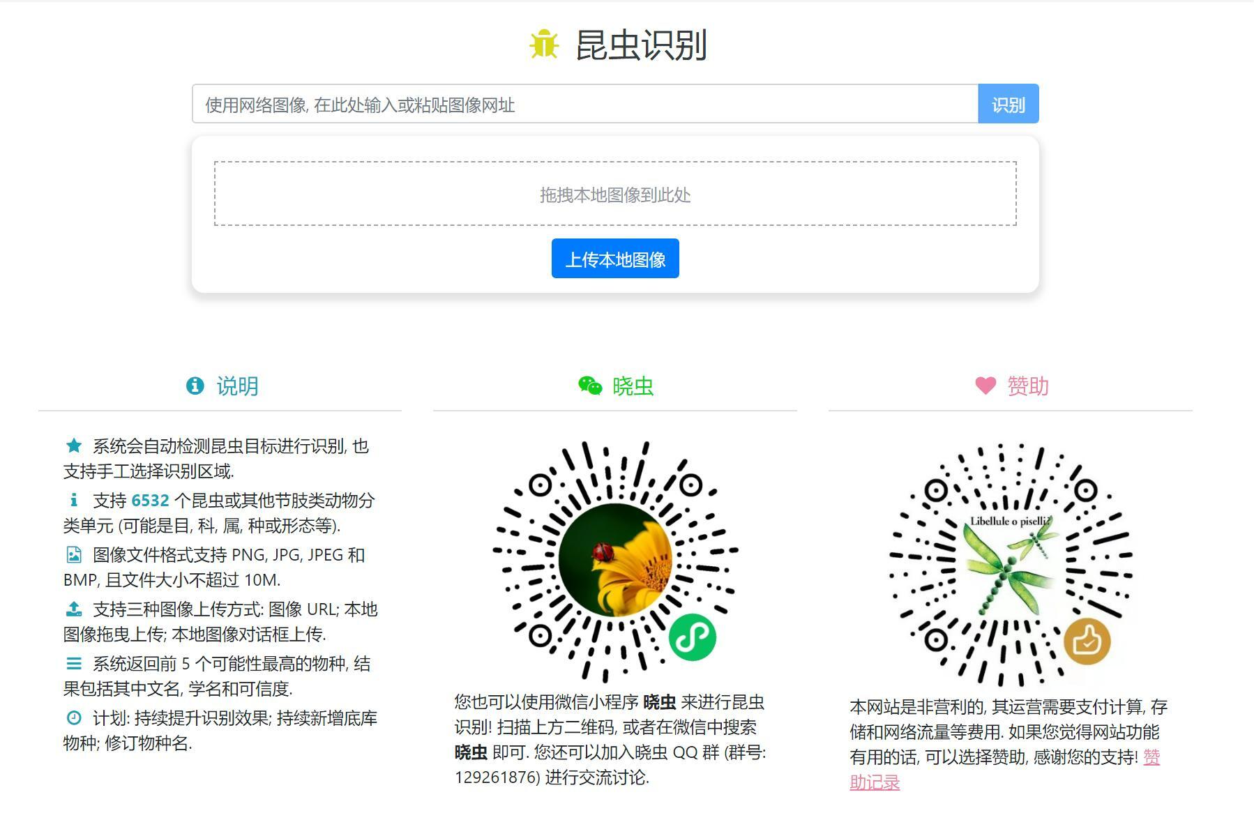 「晓虫」的Web版支持三种图像上传方式: 图像 URL; 本地图像拖曳上传; 本地图像对话框上传.