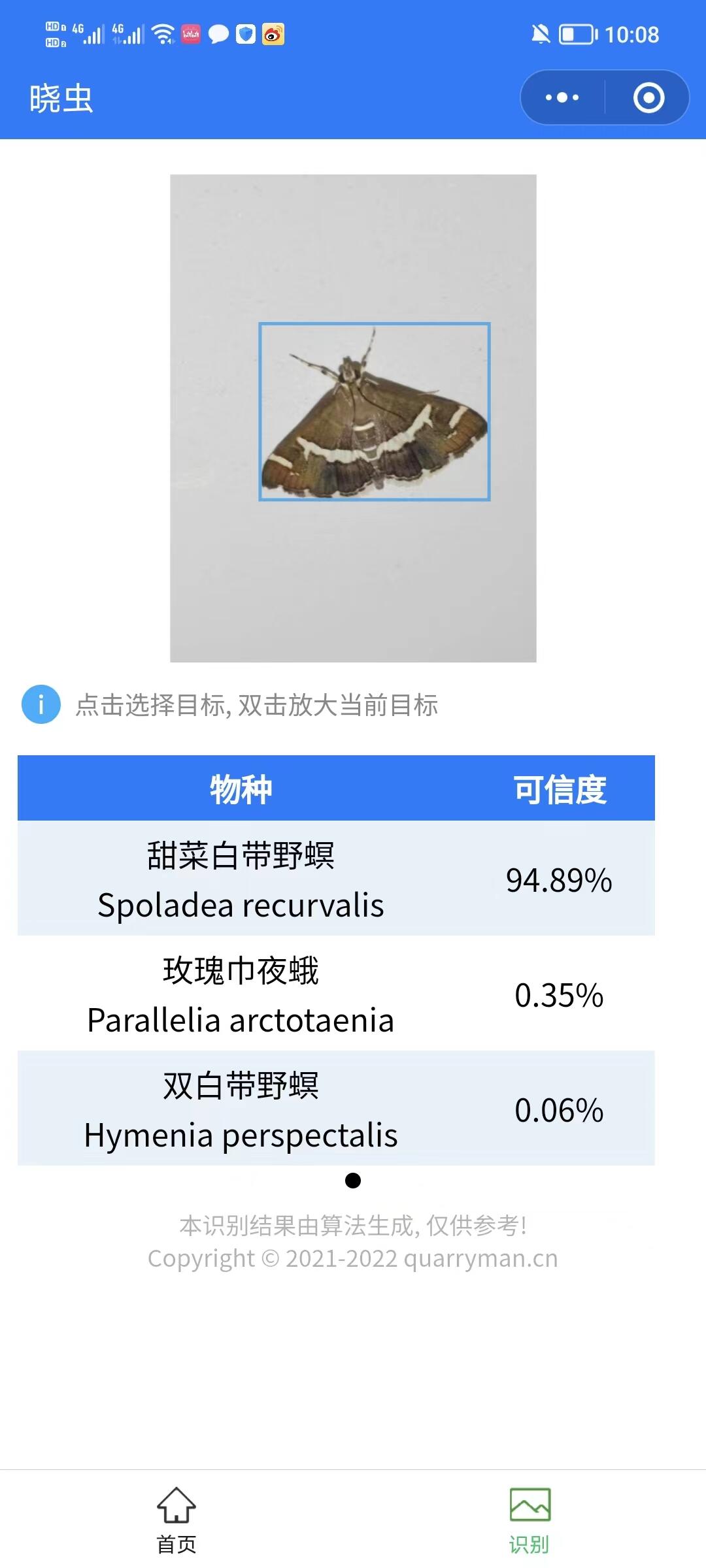 「晓虫」会自动检测图像中所有昆虫类目标的位置, 并给出每个昆虫目标的若干最有可能的鉴定结果. 鉴定结果包括中文名, 学名和可信度等信息.