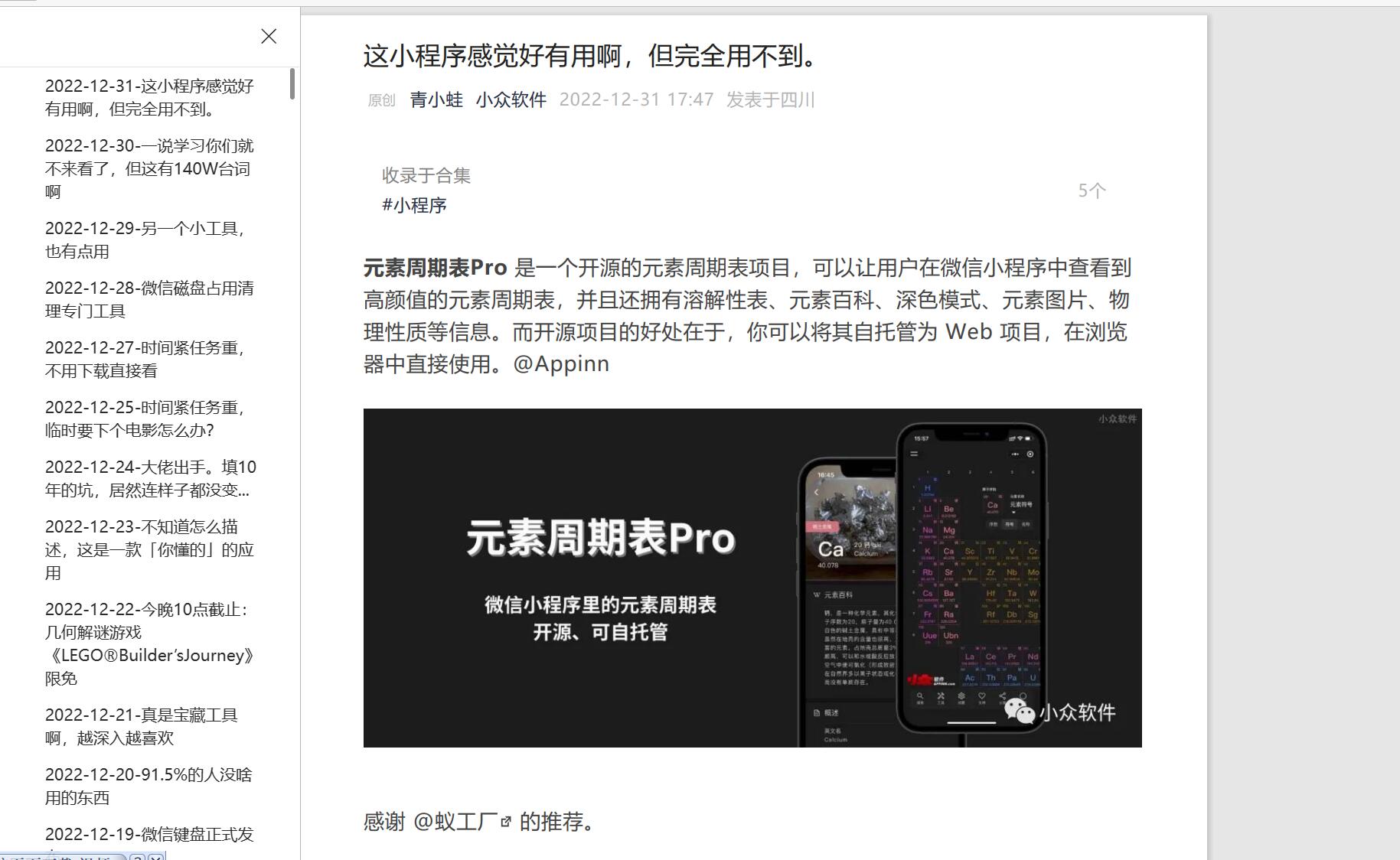 关注公众号小众软件很久了,不过偶尔才看看,这次周末正好抓取了下2022年的所有文章,共332篇,几乎日更,青小蛙太敬业了,抓取的excel文件数据包含文章日期,文章标题,文章链接,文章简介,文章作者,文章封面图,是否原创,IP归属地,阅读数,在看数,点赞数,留言数,赞赏次数等。