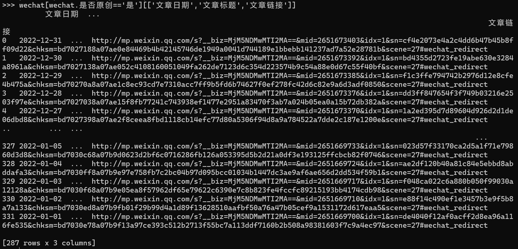 wechat[[‘文章日期’,‘文章标题’,‘文章链接’,‘阅读数’]].sort_values(by=‘阅读数’, ascending=False).head(10)